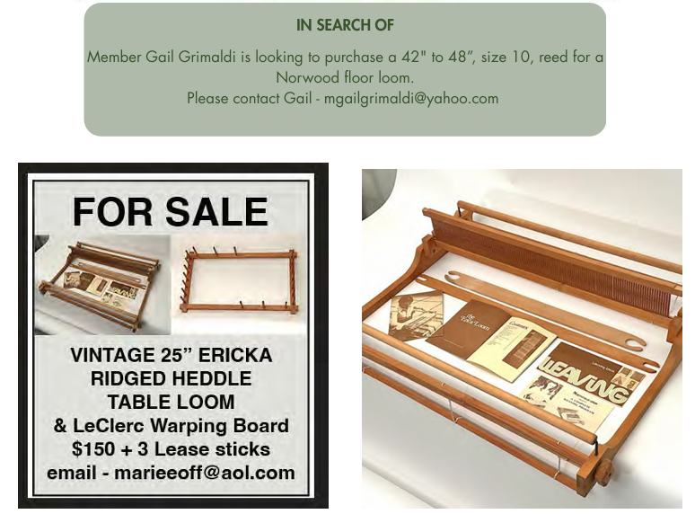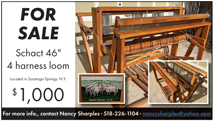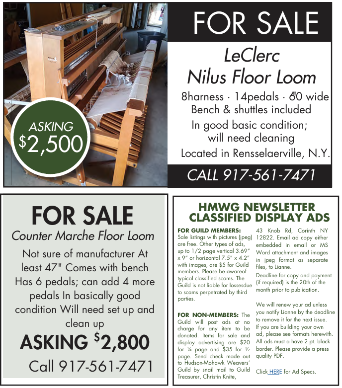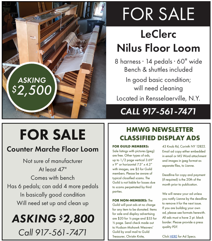 For Non-members: The Guild will post ads at no charge for any item to be donated. Items for sale and display advertising are $20 for ¼ page and $35 for ½ page. Send check made out to Hudson-Mohawk Weavers’ Guild by snail mail to Guild Treasurer, Christin Knite, 43 Knob Rd, Corinth NY 12822.